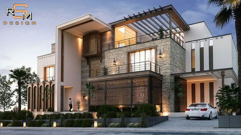 Elegant elevation with stone cladding highlights.