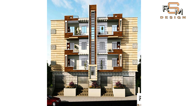 Layered front elevation with framed balconies.