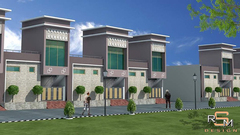 Repetitive row housing facade with unified design language.
